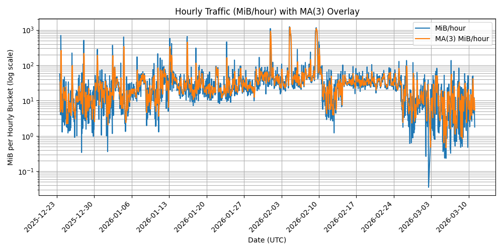 The following code takes the rollups and collects the MiB from the hourly buckets