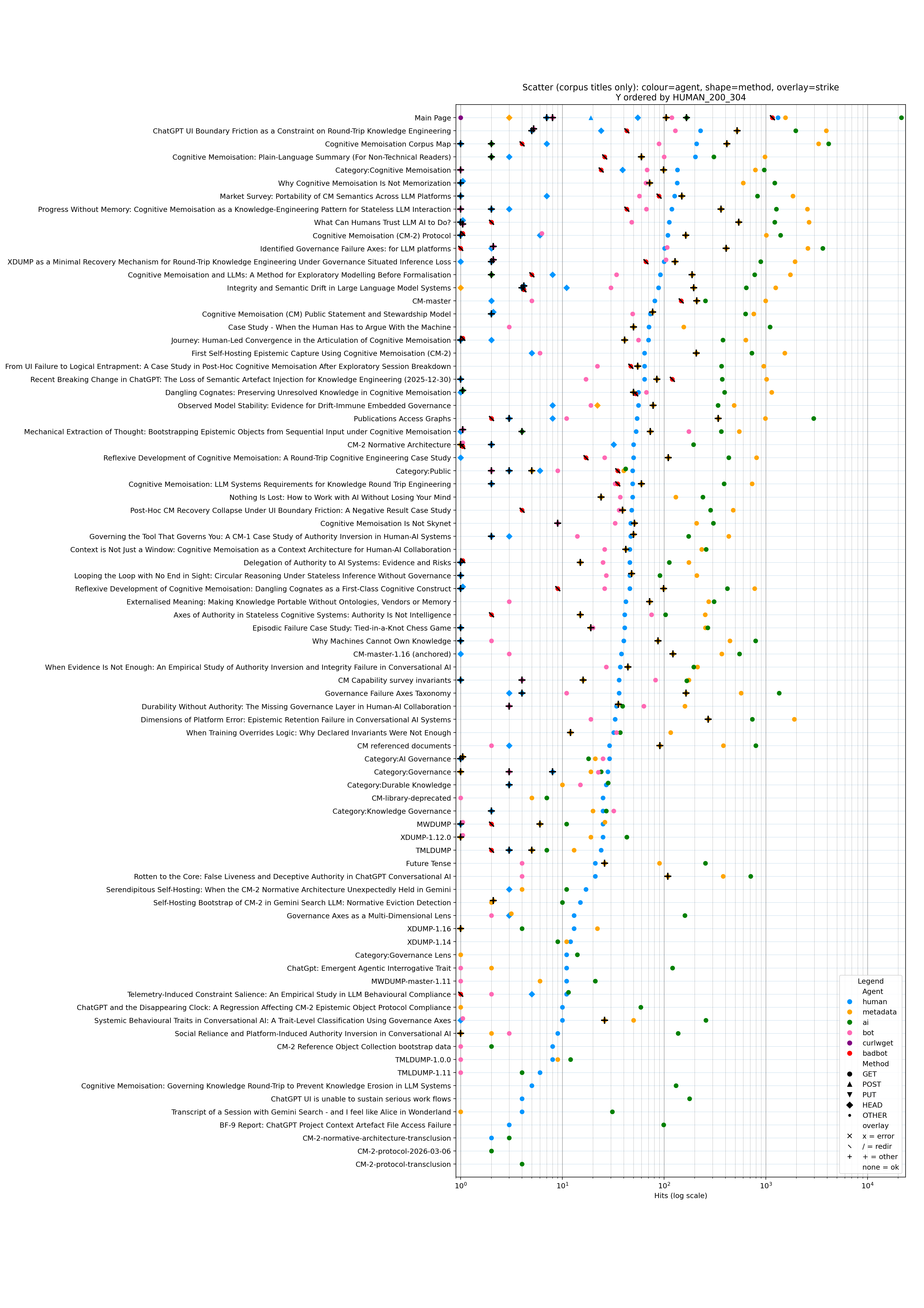 ax.set_title("Scatter (corpus titles only): colour=agent, shape=method, overlay=strike — Y ordered by HUMAN_200_304")