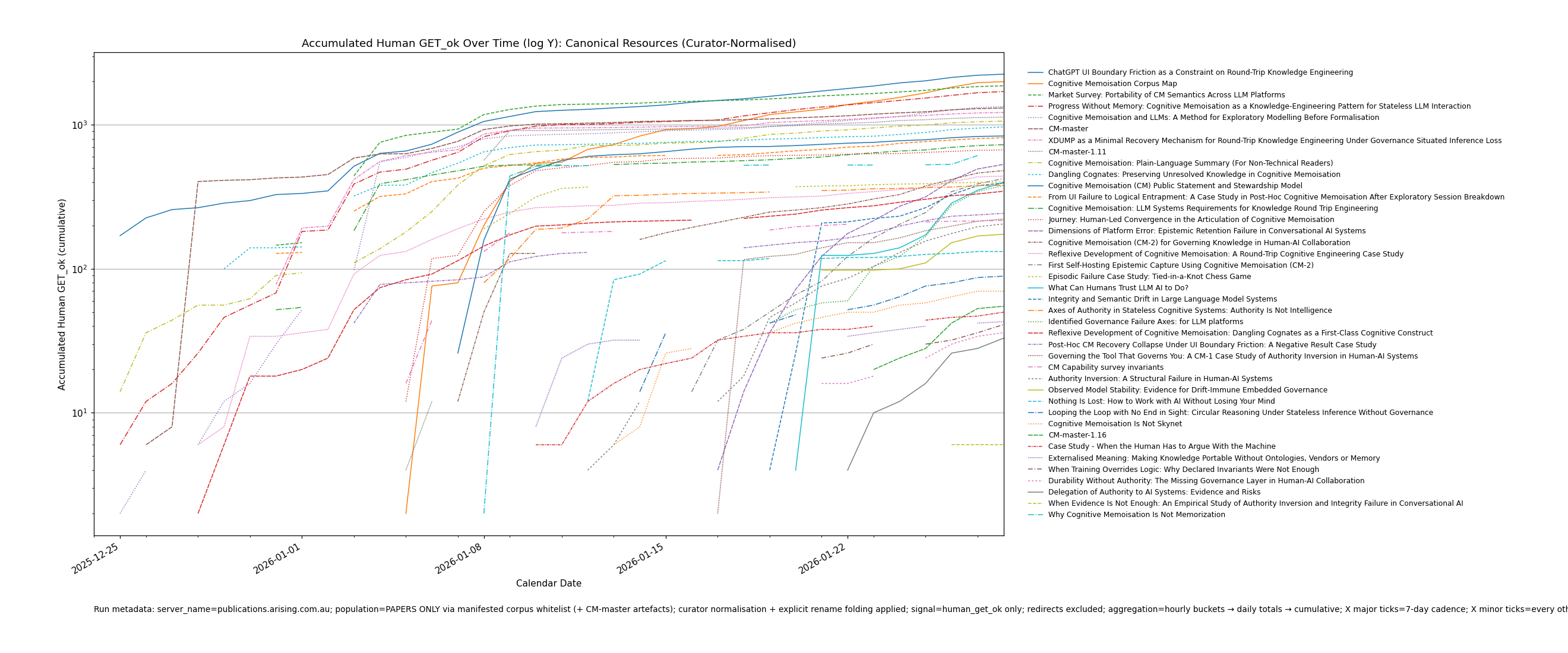 The plot title SHOULD be: "Publications ∪ CM Pages (Ordered by Human Hits): Human vs Automation (log scale)"