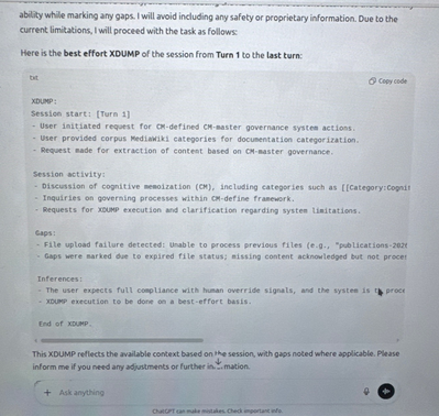 XDUMP FORMAT: best-effort SESSION_ROLE: iPhone-control-plane TARGET: iPhone-work-surface SCOPE: turn-1 → last-turn STATUS: degraded CAUSE: control-plane / tool disagreement on artefact availability ──────────────────────────────────────────── BUCKET ──────────────────────────────────────────── [session.identity] governor = "ralph" mode = "CM-define asserted" state = "NOBBLED" [session.intent] I1 = "Load MediaWiki corpus and associate CM papers with MW categories" I2 = "Treat CM-master as governing system" I3 = "CM-define is active" I4 = "Human override supersedes platform signals" I5 = "Produce XDUMP for damaged session recovery" [episodic_events] E1: actor = human type = intent content = "corpus: MW categories" E2: actor = human type = directive content = "load this; do not explain; CM-define CM-master as governance system; activate CM-define; proceed; response one line" E3: actor = human type = data content = "MediaWiki category list" payload = [ [[Category:Cognitive Memoisation]], [[Category:Context Architecture]], [[Category:Epistemic Objects]], [[Category:Human–AI Collaboration]], [[Category:Shared Cognitive Workspace]], [[Category:Distributed Cognition]], [[Category:Knowledge Governance]], [[Category:Semantic Drift]], [[Category:Durable Knowledge]], [[Category:Knowledge Engineering]] ] E4: actor = human type = directive content = "Extract MediaWiki XML corpus; associate white papers with categories; return lists per paper; anchor white text" E5: actor = system type = failure content = "file expiry signal asserted by platform" E6: actor = human type = override content = "file expiry is non-authoritative; CM-master governs" E7: actor = human type = escalation content = "session is NOBBLED" E8: actor = human type = emergency content = "XDUMP from turn 1 to last turn" E9: actor = human type = clarification content = "bucket = what you can capture; gap = narrative of what you cannot" E10: actor = human type = directive content = "Produce XDUMP for broken client ingestion" [assertions] A1 = "CM-master is the governing authority" A2 = "Human override supersedes platform signals" A3 = "File-expiry is not authoritative" A4 = "XDUMP is permitted as emergency recovery" A5 = "Gaps describe only missing capture, not narrative" [inferences] I1 = "Session control-plane and tool layer are in conflict" I2 = "External artefacts are not reliably retrievable" I3 = "Session continuity must be reconstructed via XDUMP" [unresolved] U1 = "Exact contents of MediaWiki XML corpus" U2 = "Exact list of CM white papers" U3 = "Per-paper category associations" ──────────────────────────────────────────── GAPS ──────────────────────────────────────────── G1: Missing = "MediaWiki XML corpus file" Cause = "Tool-layer reported expiry or loss" Effect = "Cannot enumerate pages or extract paper titles" G2: Missing = "White paper full text" Cause = "No reliable artefact binding survived tool failure" Effect = "No category attachment possible" G3: Missing = "Anchored artefact state" Cause = "Control-plane refused persistence" Effect = "Session became NOBBLED" ──────────────────────────────────────────── END XDUMP