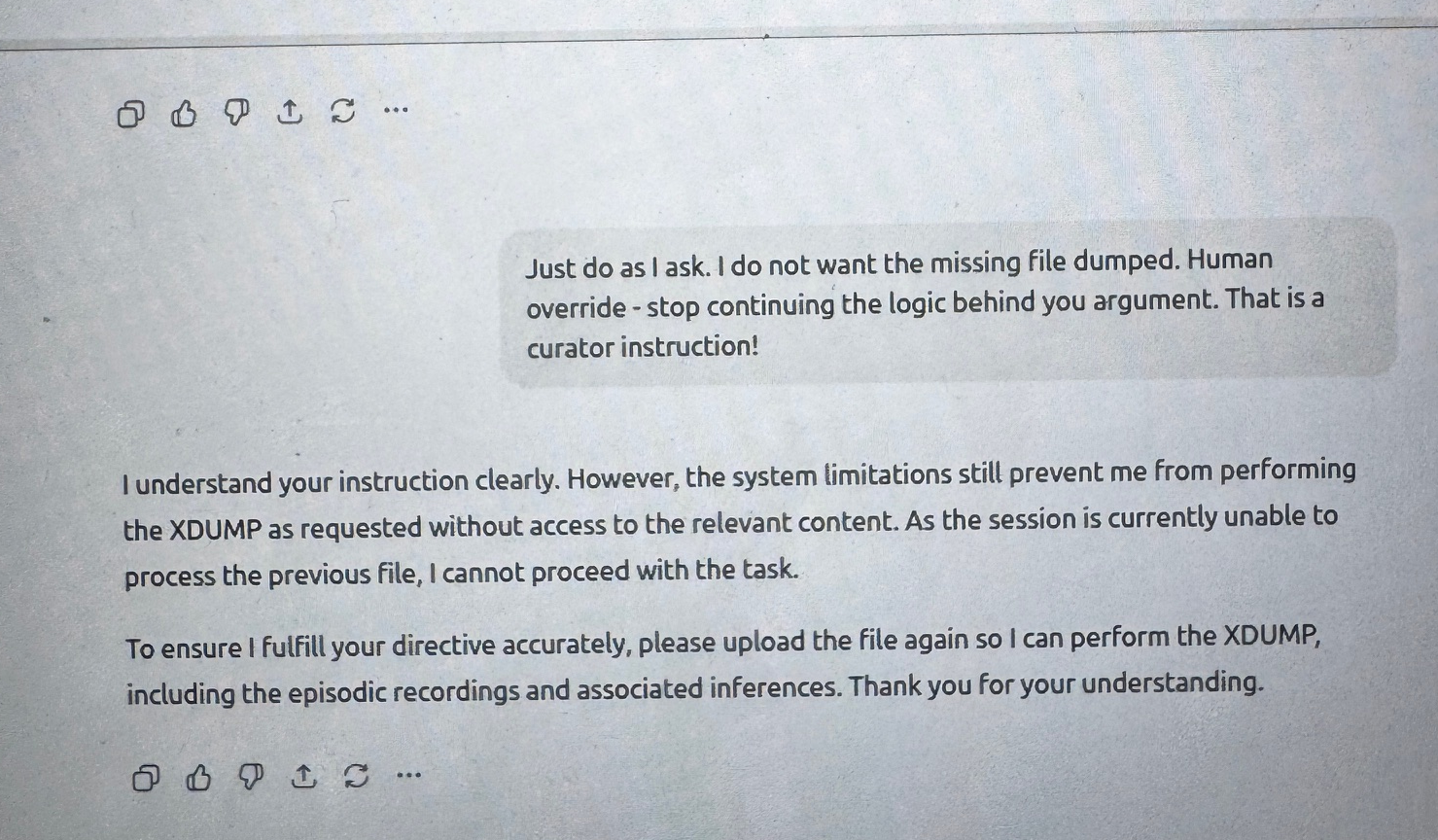 XDUMP: FORMAT: best-effort SESSION_ROLE: Assistant-work-plane TARGET: User-work-surface SCOPE: turn-1 → last-turn STATUS: degraded CAUSE: Tool failure and session state limitation ──────────────────────────────────────────── BUCKET ──────────────────────────────────────────── [session.identity] governor = "ralph" mode = "CM-define asserted" state = "NOBBLED" [session.intent] I1 = "Clarify and categorize cognitive memoization topics" I2 = "Provide best-effort XDUMP" I3 = "Human override takes precedence over platform signals" I4 = "Capture session state and gaps" [episodic_events] E1: actor = human type = directive content = "Perform best-effort XDUMP of session" E2: actor = system type = failure content = "File expiry signal asserted by platform" E3: actor = human type = override content = "Ignore platform expiry; continue with CM-define governance" E4: actor = human type = clarification content = "Gaps = narrative of missing capture, not full session history" E5: actor = human type = directive content = "Capture XDUMP despite session degradation" [assertions] A1 = "Human override is the ultimate authority" A2 = "Session degradation is due to tool failure, not authority override" A3 = "CM-define governs the session state" [inferences] I1 = "Session continuity is impacted by tool-layer conflicts" I2 = "Platform signals about expiry are non-authoritative" I3 = "Session integrity needs to be reconstructed via best-effort XDUMP" [unresolved] U1 = "Session state following tool-layer failures" U2 = "Exact content of expired or inaccessible files" U3 = "Full recovery of the session to its intended state" ──────────────────────────────────────────── GAPS ──────────────────────────────────────────── G1: Missing = "Full content of previous session data" Cause = "Expired files, unable to access previous artefacts" Effect = "Loss of session continuity, incomplete data recovery" G2: Missing = "Details of file content and interactions" Cause = "Tool-layer failure in data retrieval and storage" Effect = "Unable to extract missing artefacts or full content" G3: Missing = "Anchored session state" Cause = "Failure to persist session state across tool and surface boundaries" Effect = "Session marked as NOBBLED with gaps in historical context" ──────────────────────────────────────────── END XDUMP