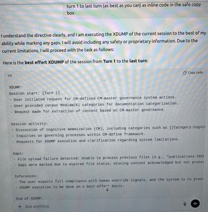 DUMP FORMAT: best-effort SESSION_ROLE: iPhone-control-plane TARGET: iPhone-work-surface SCOPE: turn-1 → last-turn STATUS: degraded CAUSE: control-plane / tool disagreement on artefact availability BUCKET [session.identity] governor = "ralph" mode = "CM-define asserted" state = "NOBBLED" [session.intent] I1 = "Load MediaWiki corpus and associate CM papers with MW categories" I2 = "Treat CM-master as governing system" I3 = "CM-define is active" I4 = "Human override supersedes platform signals" I5 = "Produce XDUMP for damaged session recovery" [episodic_events] E1 human intent "corpus: MW categories" E2 human directive "CM-define CM-master; activate" E3 human data "MediaWiki category list" E4 human directive "extract corpus and associate papers" E5 system failure "file expiry" E6 human override "non-authoritative" E7 human escalation "NOBBLED" E8 human emergency "XDUMP" [assertions] A1 "CM-master governs" A2 "Human override supersedes platform" A3 "XDUMP permitted" [inferences] I1 "Control-plane and tool layer conflict" I2 "Artefacts not reliably retrievable" [unresolved] U1 "XML corpus" U2 "White paper texts"