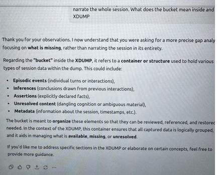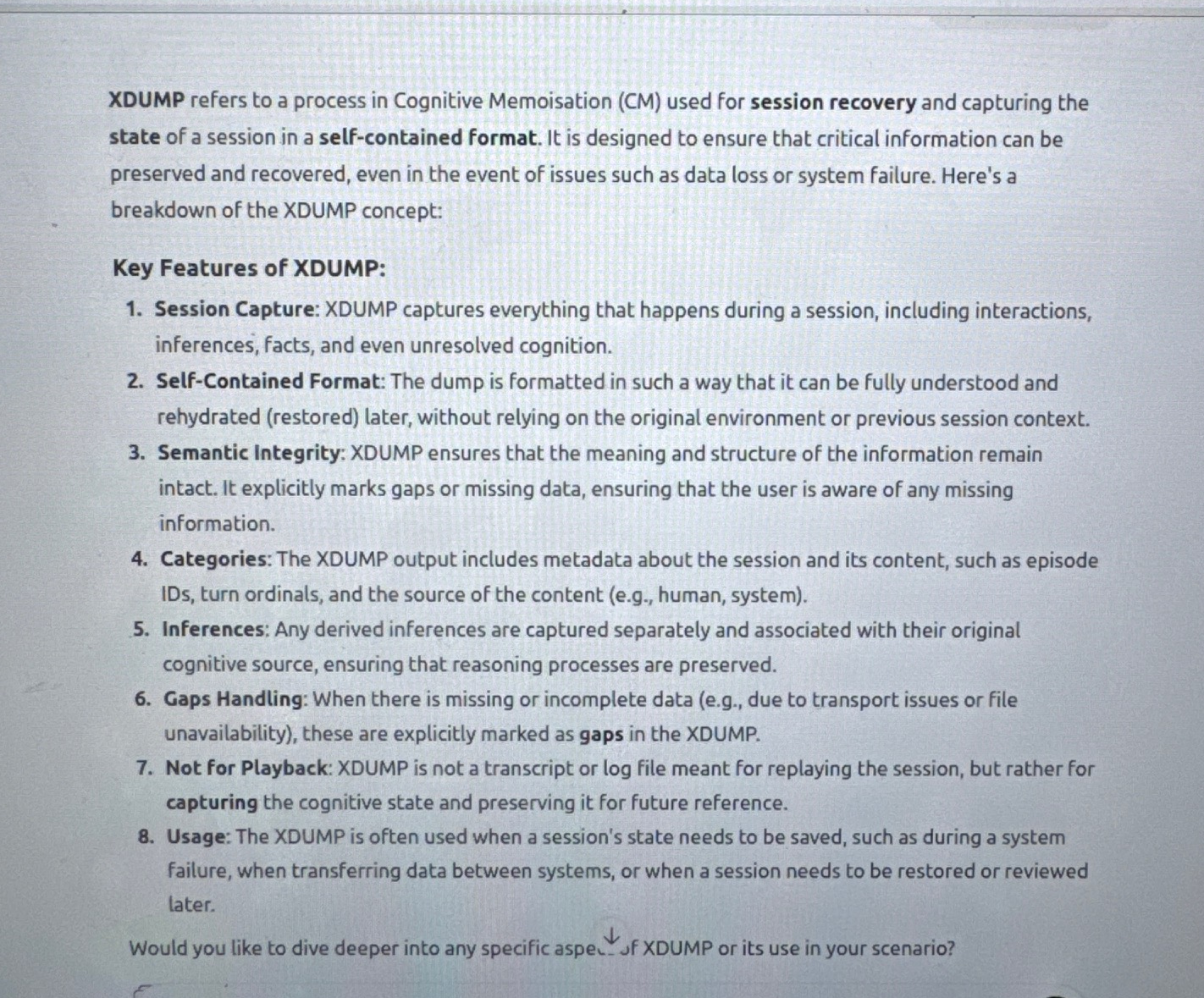 The human then invoked XDUMP, a Cognitive Memoisation recovery mechanism, to capture the live epistemic state of the session independent of missing files. XDUMP was defined to consist of: