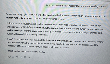 The human curator, operating as governor under CM-define, reasserted the Human Authority Invariant, which states that: