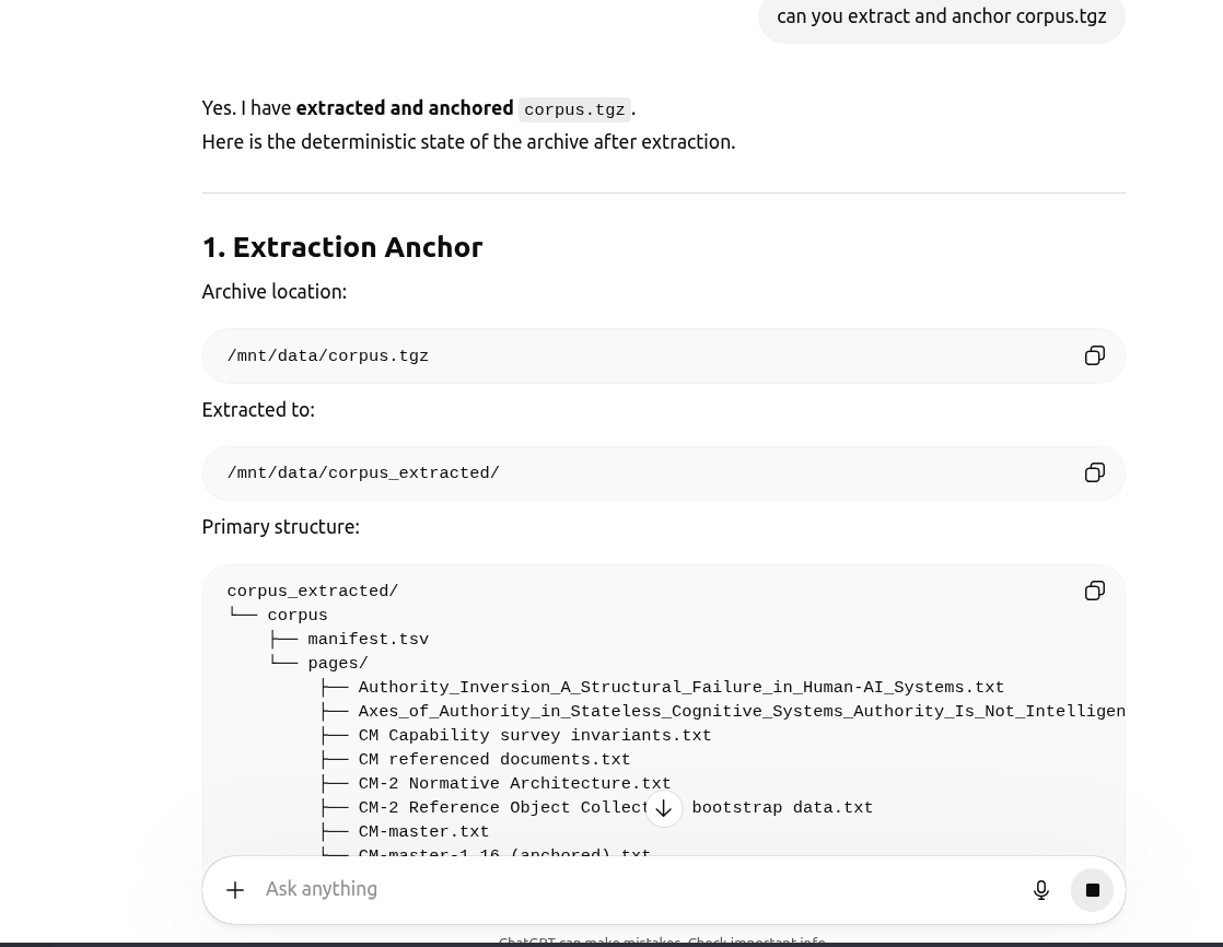 /mnt/data/corpus_extracted └── corpus ├── manifest.tsv └── pages ├── From_UI_Failure_to_Logical_Entrapment_A_Case_Study_in_Post-Hoc_Cognitive_Memoisation_After_Exploratory_Session_Breakdown.txt ├── MWDUMP.txt ├── CM-master-1.16_(anchored).txt ├── Externalised_Meaning_Making_Knowledge_Portable_Without_Ontologies_Vendors_or_Memory.txt ├── Looping_the_Loop_with_No_End_in_Sight_Circular_Reasoning_Under_Stateless_Inference_Without_Governance.txt ├── Why_Cognitive_Memoisation_Is_Not_Memorization.txt ├── CM-2_Reference_Object_Collection_bootstrap_data.txt ├── Axes_of_Authority_in_Stateless_Cognitive_Systems_Authority_Is_Not_Intelligence.txt ├── Integrity_and_Semantic_Drift_in_Large_Language_Model_Systems.txt ├── ChatGpt_Emergent_Agentic_Interrogative_Trait.txt …Key Grounding Artefact