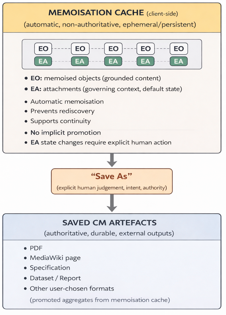 In CM, memoisation is used in its original technical sense: the automatic caching of results to avoid unnecessary recomputation. EO are therefore automatically memoised in a client-side cache to support continuity and prevent rediscovery across interactions. This memoisation is non-authoritative and may be ephemeral or persistent, but it is always subordinate to explicit human governance. Memoisation enables reuse without implying memory, agreement, or durability.